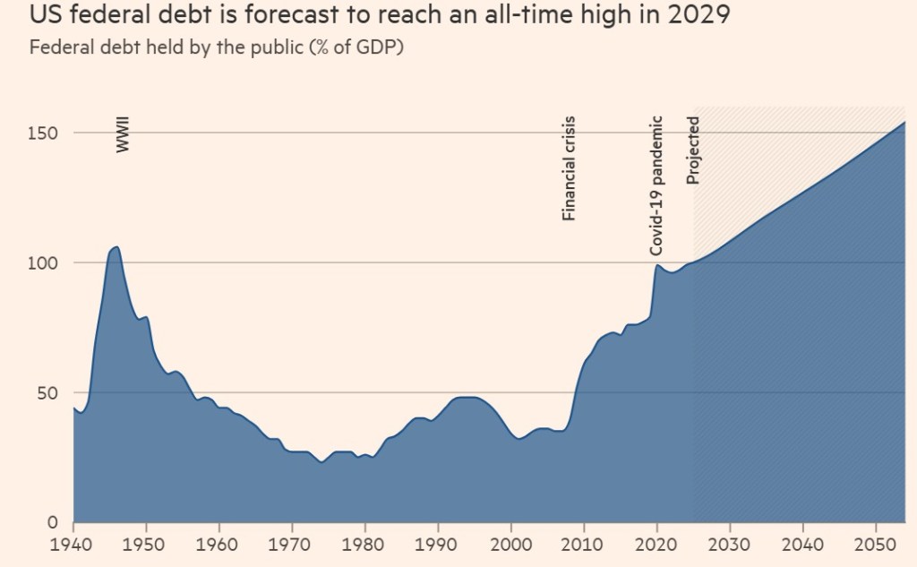 The U.S. federal debt burden is set to surpass the peak of WW2 in the coming years. Trump has given tech billionaire, Musk, the job of finding $2 trillion in federal spending cuts, by the middle of next year. The U.S. is forecast to have reached an all time high in 2029, as seen on the diagram